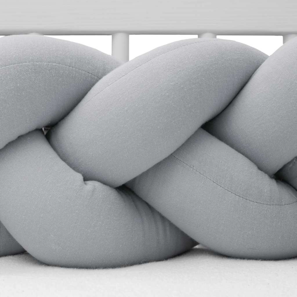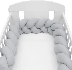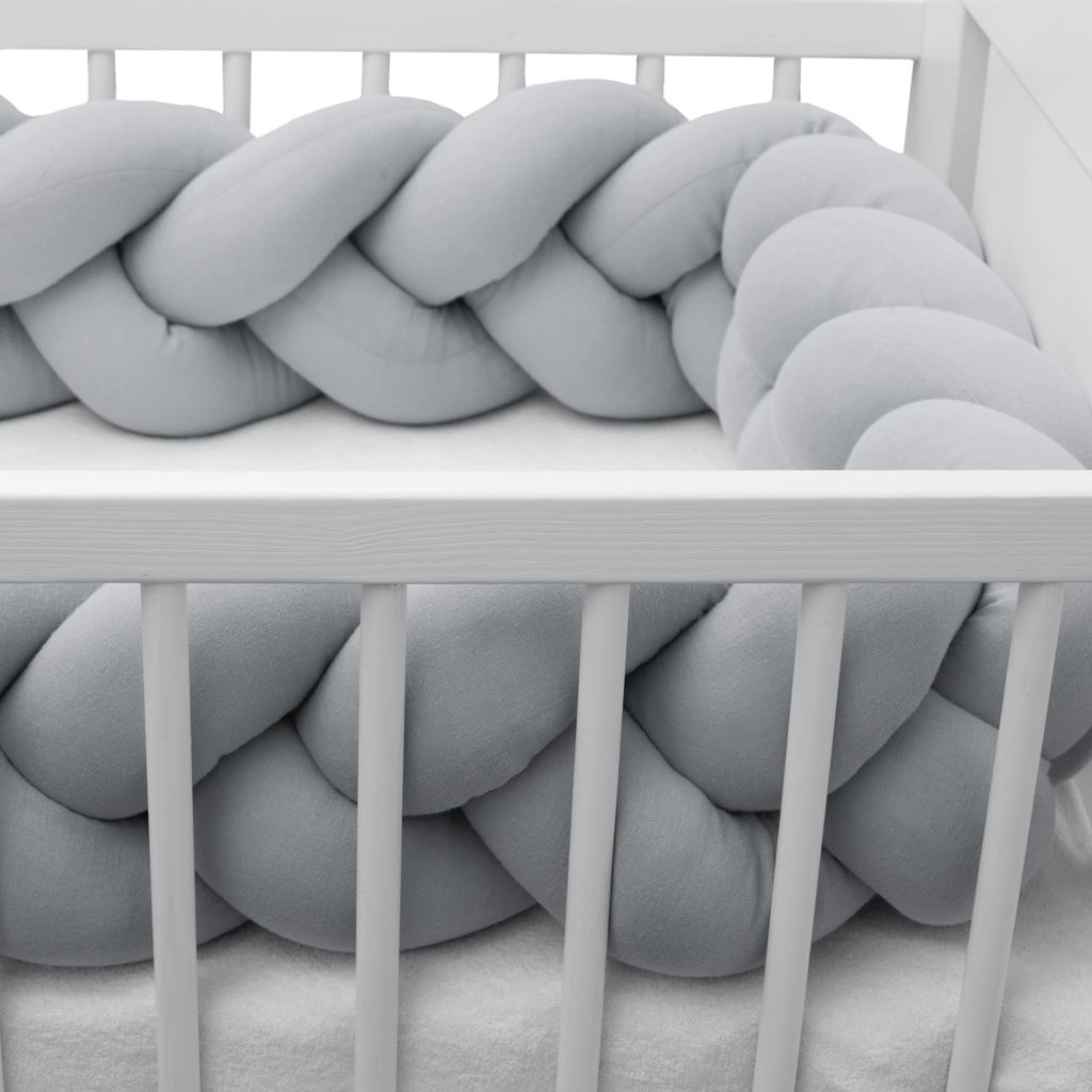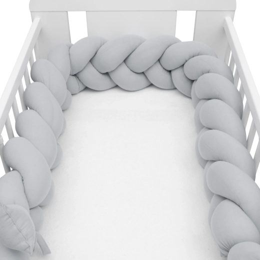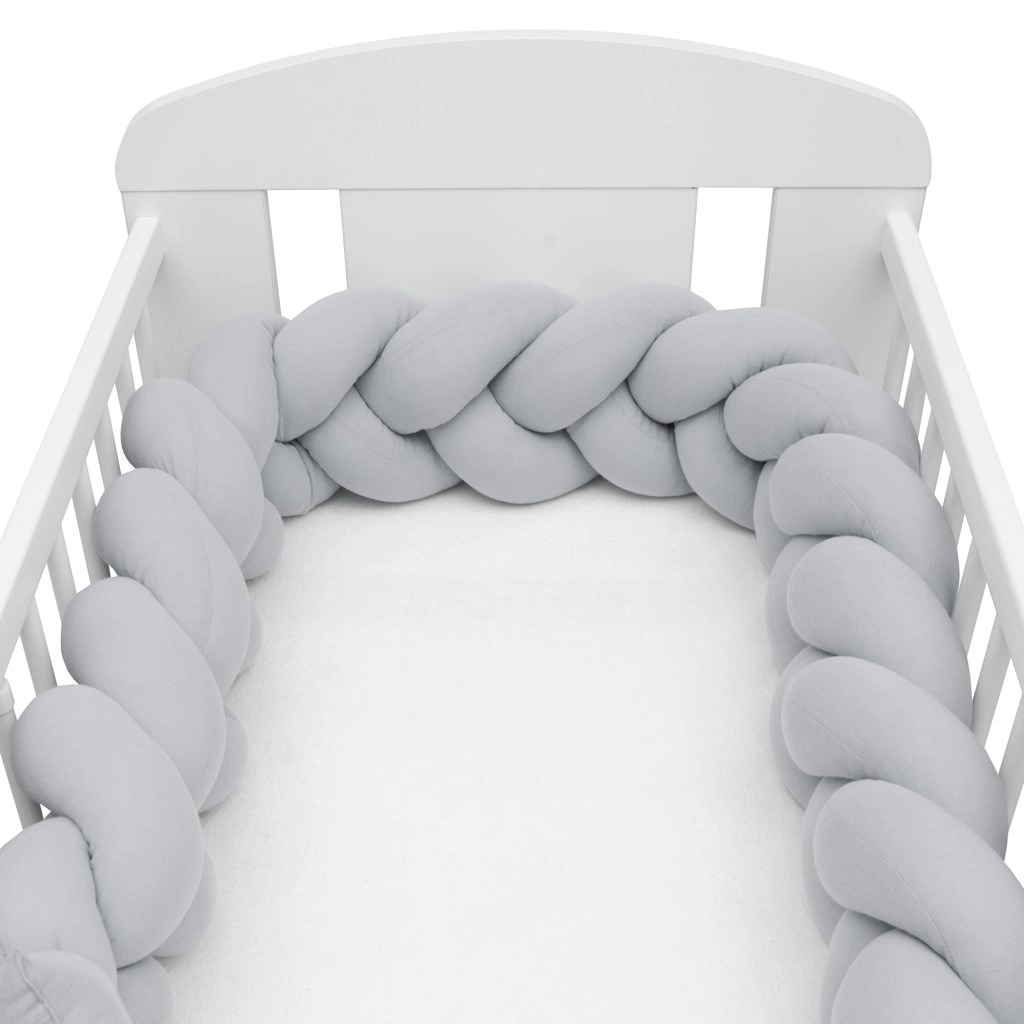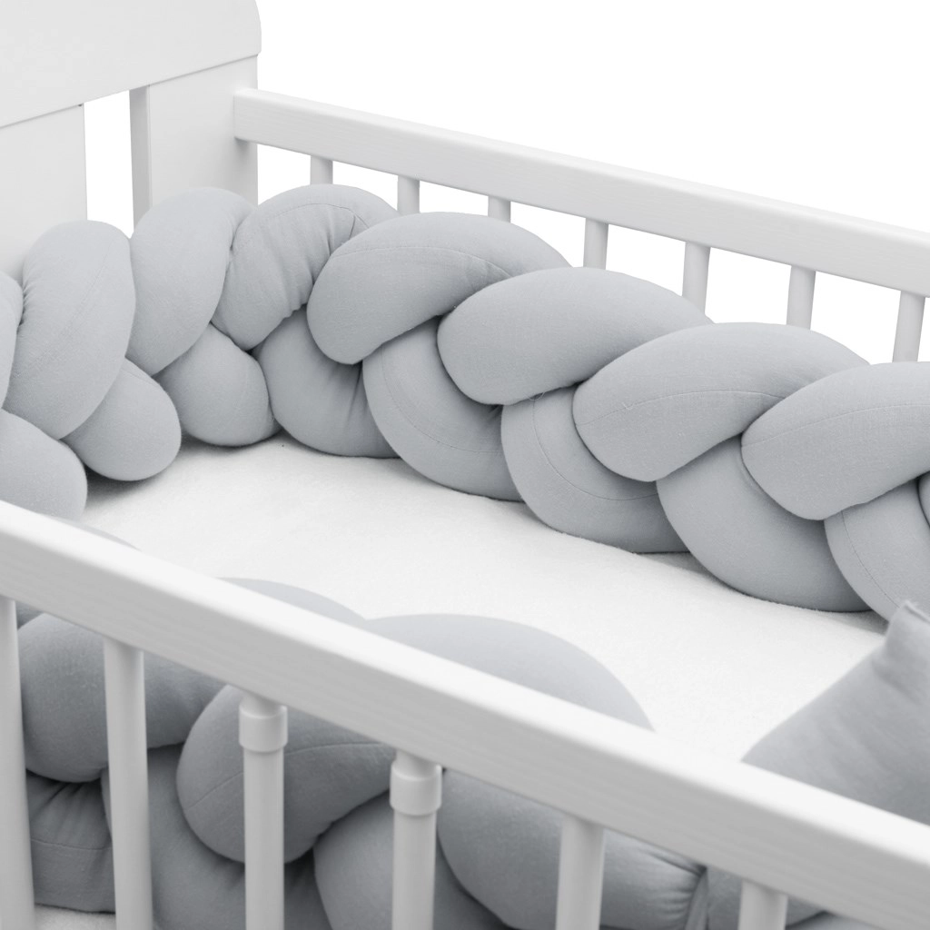 Împletitura moale din muselină New Baby, în culoare gri deschis, este o apărătoare modernă pentru pătuțul bebelușului, care oferă siguranță, confort și circulație a aerului. Datorită muselinei respirabile și umpluturii antialergice, protejează bebelușul de loviturile în barele pătuțului, izolează de frig și se adaptează ușor oricărui pătuț.