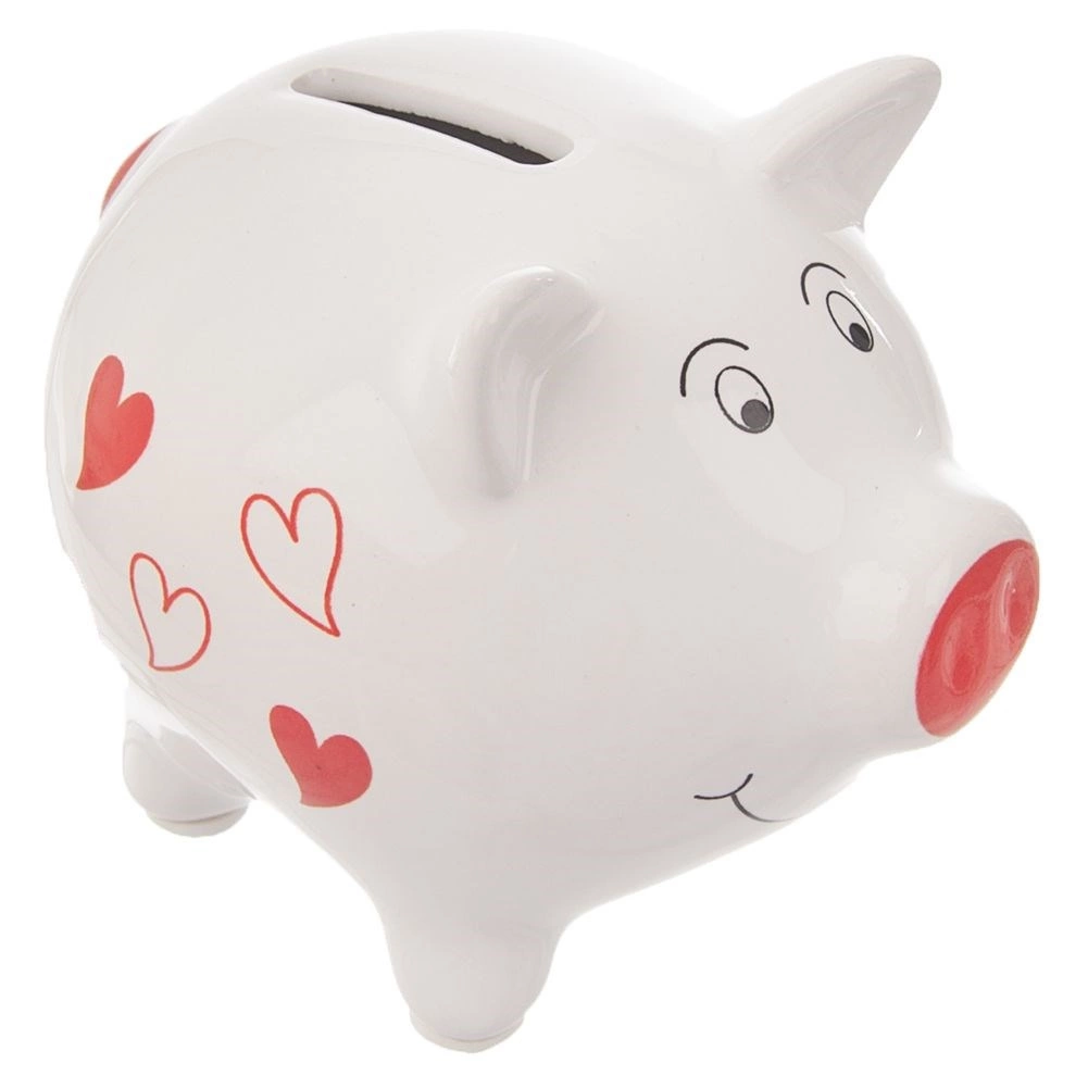 Pușculița ceramică în formă de porcușor este o alegere excelentă pentru copii și adulți care doresc să înceapă să pună deoparte monede și bancnote în mod regulat. Glazura albă lucioasă cu inimioare roșii conferă pușculiței un aspect jucăuș, potrivit atât pentru camere moderne, cât și pentru camere de copii.