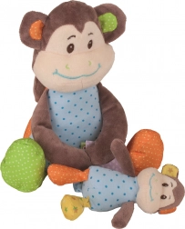 Maimuțica de pluș mamă, adorabilă, cu pui detașabil, va încânta orice bebeluș. Este moale, sigură și oferă un ineluș de dentiție și o zornăitoare pentru distracție și dezvoltarea funcțiilor cognitive. Culorile vii susțin percepția senzorială și oferă copiilor mângâiere și prietenie.
