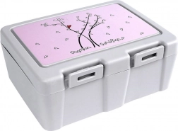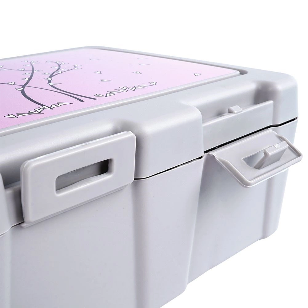 Cutia este fabricată din plastic de calitate, sigur pentru contactul cu alimentele, în culoare gri elegantă, cu panou decorativ roz cu inimioare. Ideală pentru copii la școală și adulți la muncă, pentru excursii sau călătorii. Pentru menținerea aspectului nu se recomandă spălarea în mașina de spălat vase și nici încălzirea la cuptorul cu microunde.