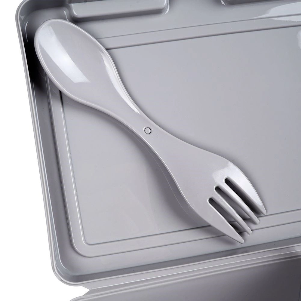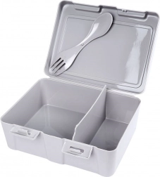 Cutia pentru gustări cu două compartimente păstrează alimentele separat și proaspăt. Include un tacâm inteligent 2în1 (lingură/furculiță) cu lungimea de 14,5 cm, cu loc dedicat sub capac, astfel îl veți avea mereu la îndemână. Construcția durabilă, dimensiunile compacte și clemele solide asigură o închidere fiabilă în timpul transportului.