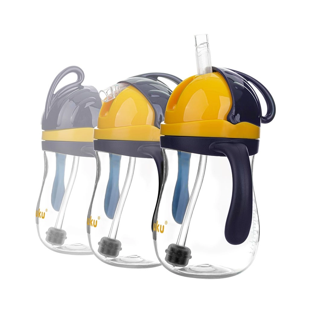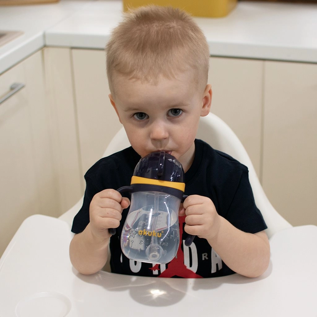 Sticla pentru copii Akuku cu pai din silicon cu greutate este concepută pentru băut independent, fără vărsări. Greutatea de la capătul paiului urmărește nivelul băuturii, astfel încât copilul poate bea confortabil așezat, în cărucior sau chiar cu sticla cu susul în jos. Capacul flip protejează paiul și previne murdărirea.