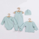 Practic și delicat, setul pentru bebeluși NEW BABY I AM, 4 piese, în culoarea albastră, este ideal pentru maternitate și pentru primele zile acasă. Conține body cu capse, salopetă (dupași), jachetă și căciuliță din 100% bumbac pentru confort maxim și piele sensibilă a bebelușului. Închiderea ușoară facilitează schimbarea scutecului și îmbrăcarea, iar modelul modern oferă setului un aspect stilat.