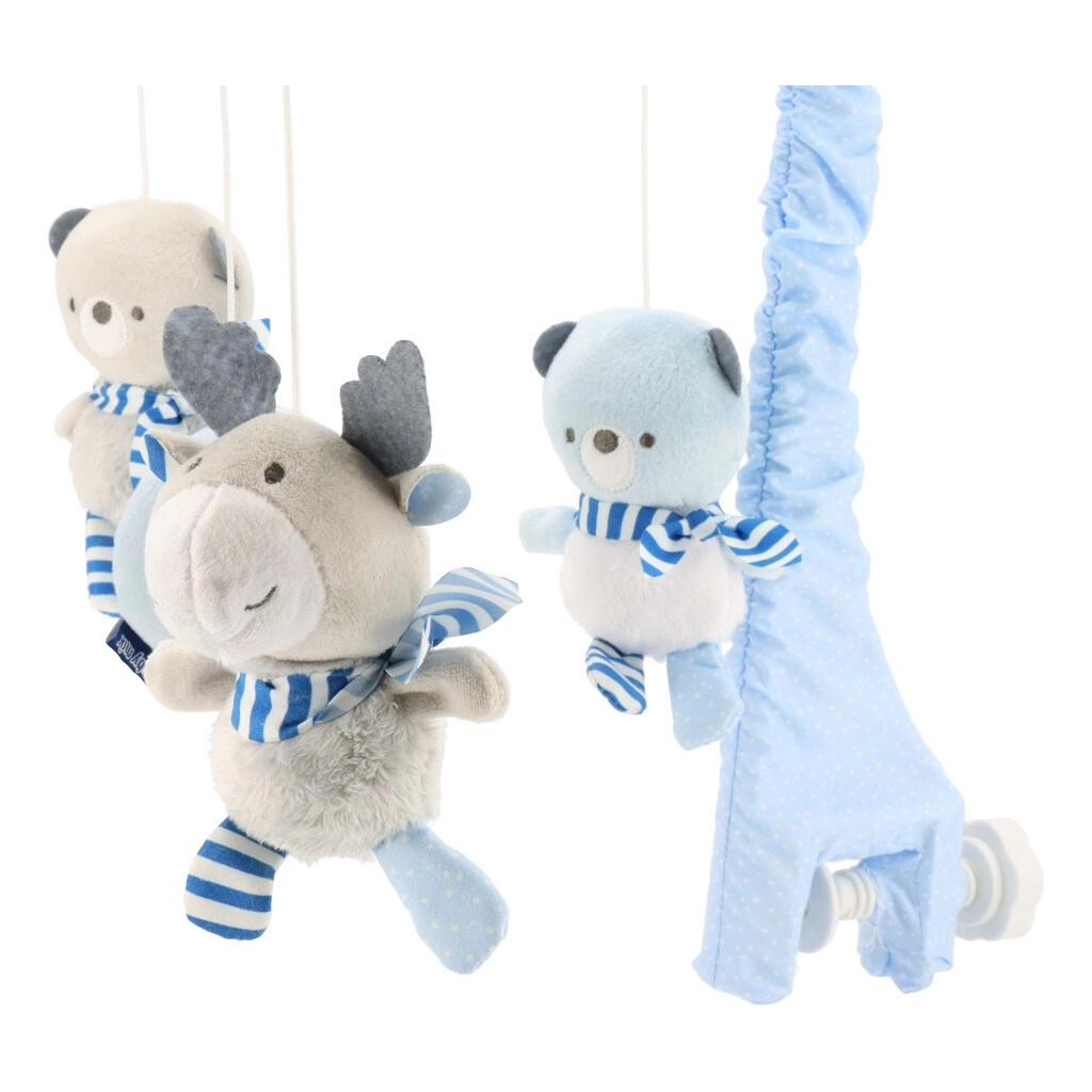 Personajele textile drăgălașe, în culori blânde, stimulează percepția vizuală și captează atenția bebelușului în timpul rotației.