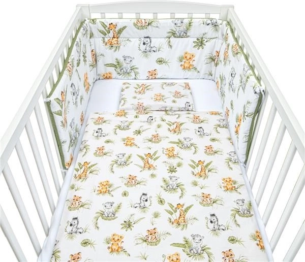 Oferiți camerei copilului gingășie și stil cu lenjeria NEW BABY Jungle. Jerseul satinat din bumbac (100% bumbac) este respirabil, plăcut la atingere și delicat cu pielea sensibilă. Apărătoarea practică protejează bebelușul de loviturile de barele pătuțului și creează un mediu confortabil pentru somn.
