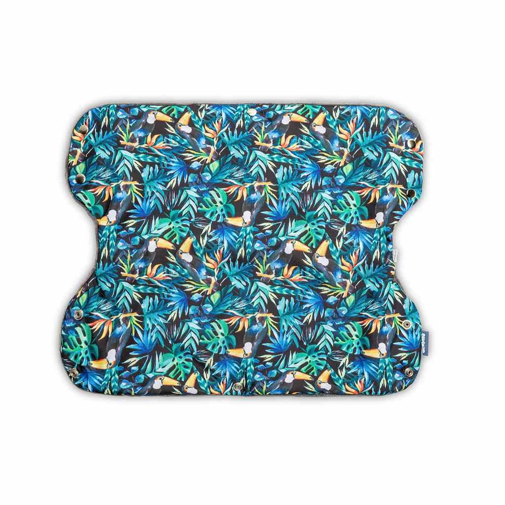 Muful practic pentru cărucior SENSILLO cu motiv tropical de tucani îți menține mâinile calde chiar și fără mănuși. Datorită materialelor de calitate cu excelente proprietăți termoizolante protejează fiabil împotriva frigului, vântului și burniței. Prindere ușoară cu capse și căptușeală moale, călduroasă, pentru confort maxim la fiecare plimbare.