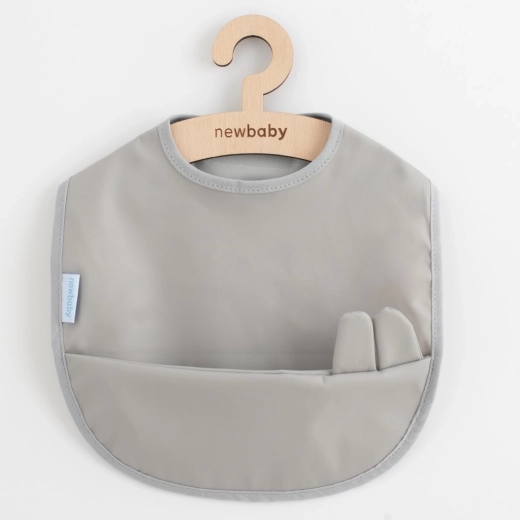 Baveta practică pentru copii NEW BABY protejează fiabil hainele în timpul mesei și al jocului. Este confecționată dintr-un material ușor și moale, care este ușor de spălat, are închidere comodă cu arici și buzunar practic pentru colectarea firimiturilor.