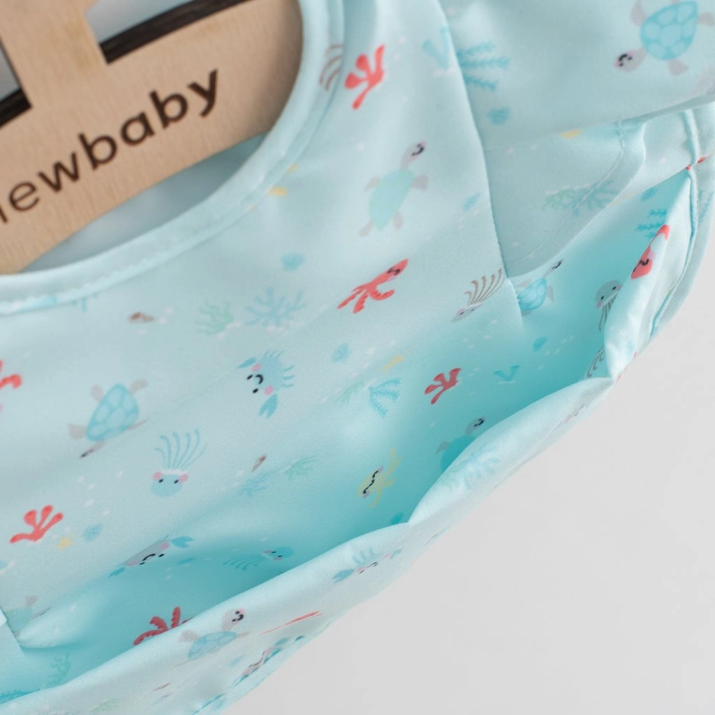 Baveta de lux New Baby cu volănașe combină un design drăguț cu funcționalitate practică. Materialul ușor și moale este plăcut la atingere, în timp ce stratul inferior impermeabil previne în mod fiabil scurgerile și murdărirea hainelor. Datorită scaiului, se închide rapid și în siguranță.