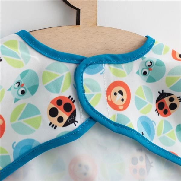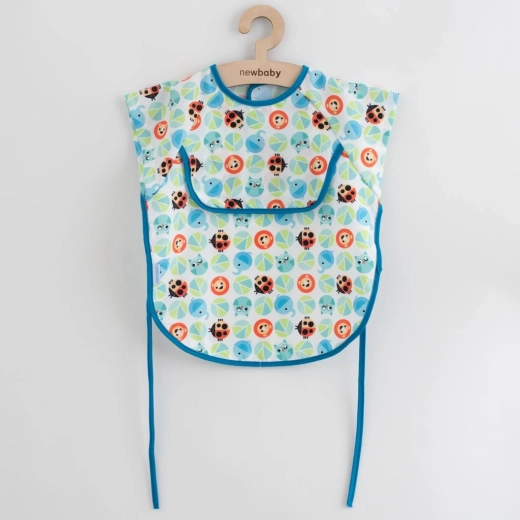 Bavețica‑șorț NEW BABY în culoare albastră este ajutorul ideal pentru hrănirea zilnică și momentele creative. Ușoară, moale și plăcută la atingere, dar totodată rezistentă și ușor de întreținut – când se murdărește, este suficient să fie ștearsă cu o cârpă umedă sau spălată la mașină. Buzunarul practic reține resturile de mâncare și lichidele, astfel încât împrejurimile și hainele să rămână cât mai curate.