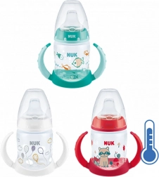 Biberon practic de învățare NUK First Choice cu volum de 150 ml și indicator de control al temperaturii, care își schimbă culoarea dacă băutura este prea fierbinte. Datorită mustiucului din silicon moale, anti-picurare și mânerele ergonomice antialunecare, le ușurează copiilor trecerea la băutul independent. Fabricat din polipropilenă fără BPA, se demontează și se curăță ușor.
