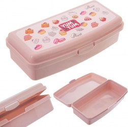 Cutia este fabricată din plastic de calitate, sigur pentru contactul cu alimentele, de culoare roz. Clema solidă asigură o închidere fiabilă și o prospețime mai îndelungată a alimentelor. Designul cu motiv „YUM YUM” adaugă o notă distractivă gustării și îi ajută pe copii să își deosebească ușor cutia.
