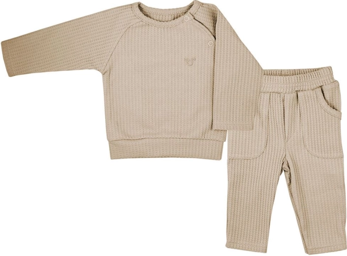 Tricoul cu mânecă lungă este echipat cu capse la umăr pentru îmbrăcare și dezbrăcare ușoare. Pantalonii au bordură mai lată, confortabilă și elastic în talie, care nu strânge. Două buzunare mai adânci accentuează designul trendy și sunt utile pentru mărunțișuri.