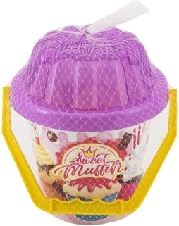 Găleata ușoară, cu mâner și motiv Sweet Muffin, servește drept spațiu de depozitare pentru întregul set și facilitează transportul în plasă.