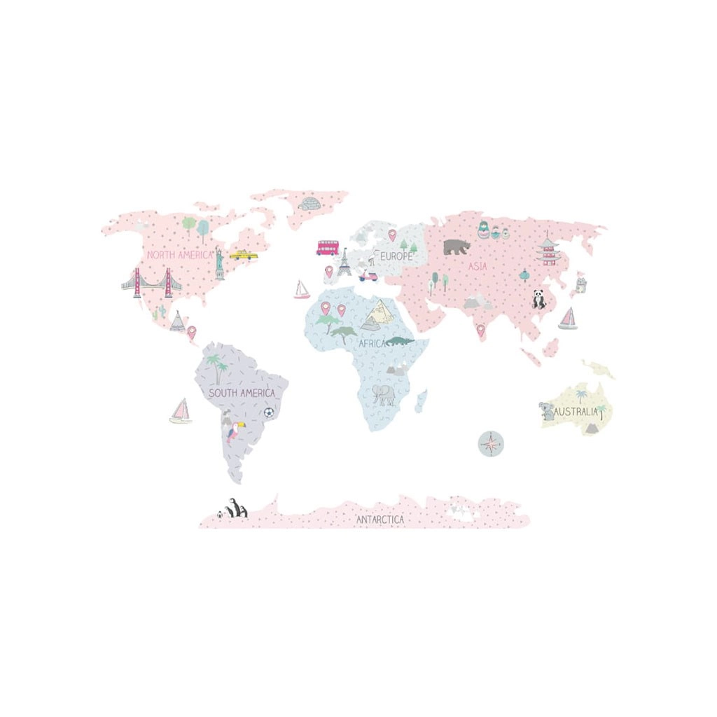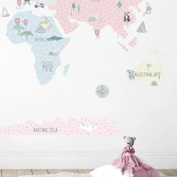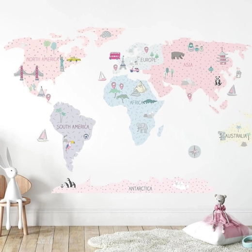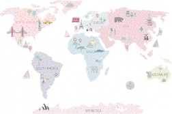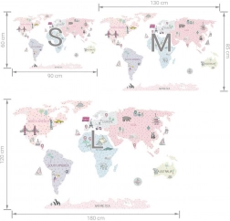Harta lumii roz, mărimea L, este o decorațiune de perete elegantă și practică pentru camera copiilor. Culorile pastelate estompate se potrivesc perfect interioarelor moderne și creează o atmosferă plăcută pentru joacă și învățare. Copiii se familiarizează în mod natural cu continentele, oceanele, punctele cardinale și reperele celebre.