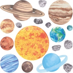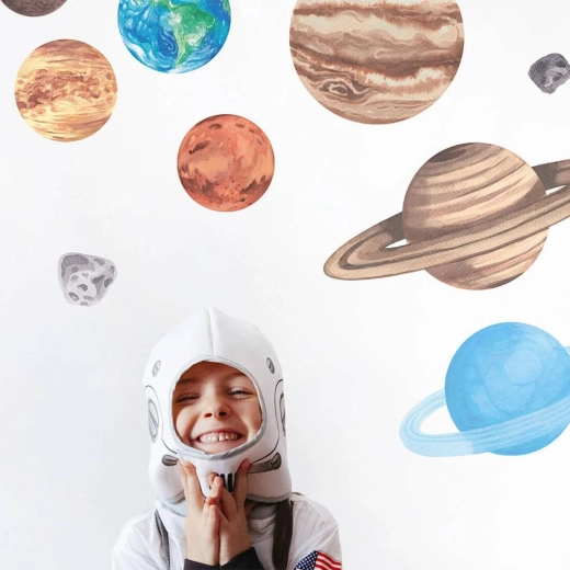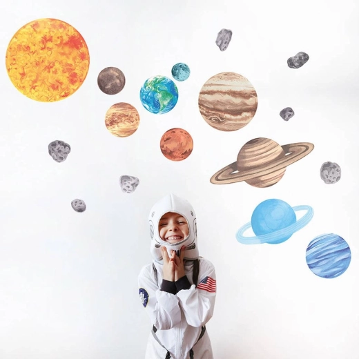 Transformați peretele într-o hartă interactivă a universului. Setul include toate cele 8 planete – Mercur, Venus, Pământ, Marte, Jupiter, Saturn, Uranus și Neptun – completate de soare, lună și asteroizi. Autocolantele au laminat mat, care protejează suprafața și ușurează aplicarea, deoarece folia este mai rigidă și se transferă mai bine.