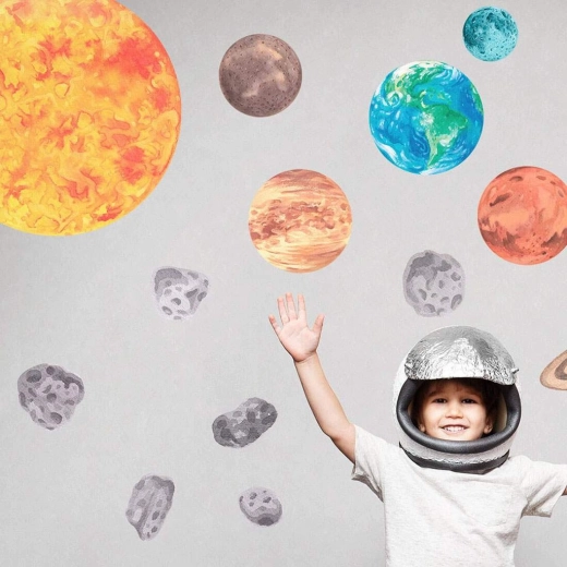Întregul sistem solar, inclusiv soarele, luna și asteroizii, stimulează curiozitatea și învățarea prin joacă direct în camera copilului.