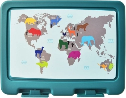 Două compartimente practice permit separarea felului principal de garnituri sau fructe. Clemele laterale puternice previn deschiderea accidentală și vărsarea conținutului, astfel încât vă puteți baza pe un rucsac sau o geantă curate. Designul turcoaz atractiv, cu hartă a lumii și animale, motivează la gustări mai sănătoase și îi bucură pe cei mici și mari.