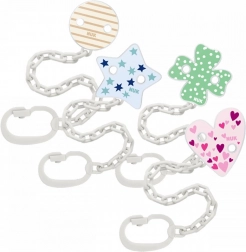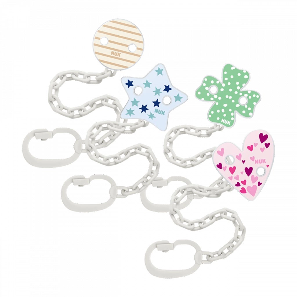 Lanțul pentru suzetă cu clemă NUK este conceput pentru a păstra suzeta mereu la îndemână și curată. Clema practică se prinde ușor de hainele copilului și ține ferm, astfel încât suzeta nu se pierde nici în timpul plimbărilor sau călătoriilor. Culorile vii și motivele vesele stimulează percepția vizuală și îi captivează chiar și pe cei mai mici bebeluși.