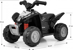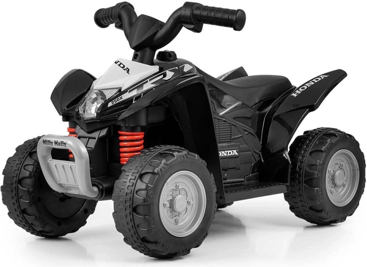 ATV-ul pentru copii licențiat HONDA ATV de la MILLY MALLY este o mini-replică a modelului TRX 250X, care îmbină designul sport, construcția sigură și manevrarea ușoară. La apăsarea pedalei pornește și se aprinde farul frontal, iar roțile late pentru teren variat asigură stabilitate, axele din oțel oferind durabilitate. Cu claxon, scaun profilat confortabil și propulsie pe baterie, este ideal pentru micii piloți de la 24 de luni.