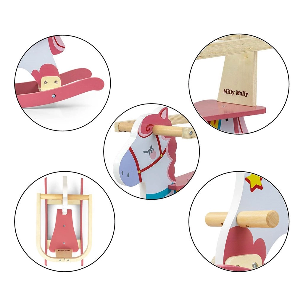 Căluțul este echipat cu mânere ferme, suporturi pentru picioare și are patine profilate care asigură legănare lină fără răsturnări nedorite. Designul modern pastel se potrivește ușor în orice cameră de copii și, datorită ambalajului pentru cadou, încântă și ca dar minunat.