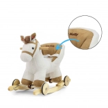 Cu ajutorul unui mecanism simplu pe șine se pot extinde rotițele, transformând în câteva clipe căluțul balansoar într-un împingător. La apăsarea urechilor, căluțul redă melodii și sunete realiste (fornăit, trap). Materialul catifelat este plăcut la atingere și ușor de întreținut.