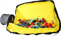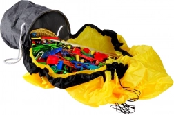 Transformă ordinea într-un joc. Acest coș cu covoraș de joacă atașat transformă dintr-o singură mișcare cuburile, mașinuțele sau figurinele împrăștiate în jucării strânse. Doar tragi de șnur și totul este pus la loc în câteva clipe. Datorită materialului rezistent la apă în culoare gri și covorașului galben cu margine neagră, coșul este ideal atât pentru camera copiilor, cât și pentru călătorii.
