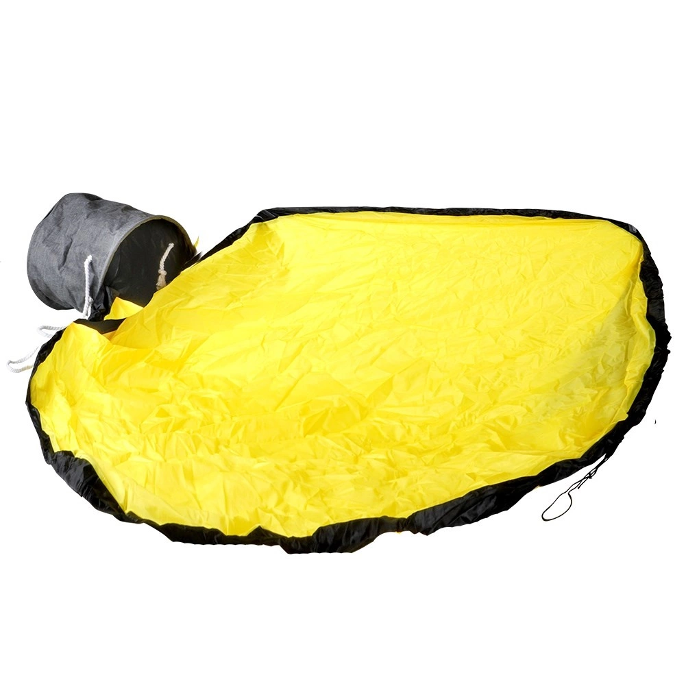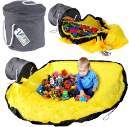 Covorașul mare galben, cu margine neagră, se strânge cu șnur după joacă și se transformă într-un sac – jucăriile nu mai fug sub mobilier, iar ordinea e gata într-un minut.