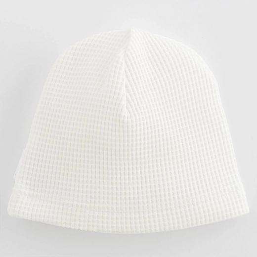 Căciuliță delicată și confortabilă pentru bebeluși din colecția NEW BABY Luxury Clothing, în culoare albă universală. Fabricată din 100% bumbac, este respirabilă, moale și blândă cu pielea sensibilă a bebelușului. Datorită croielii bine adaptate, nu strânge și stă sigur pe căpușor.