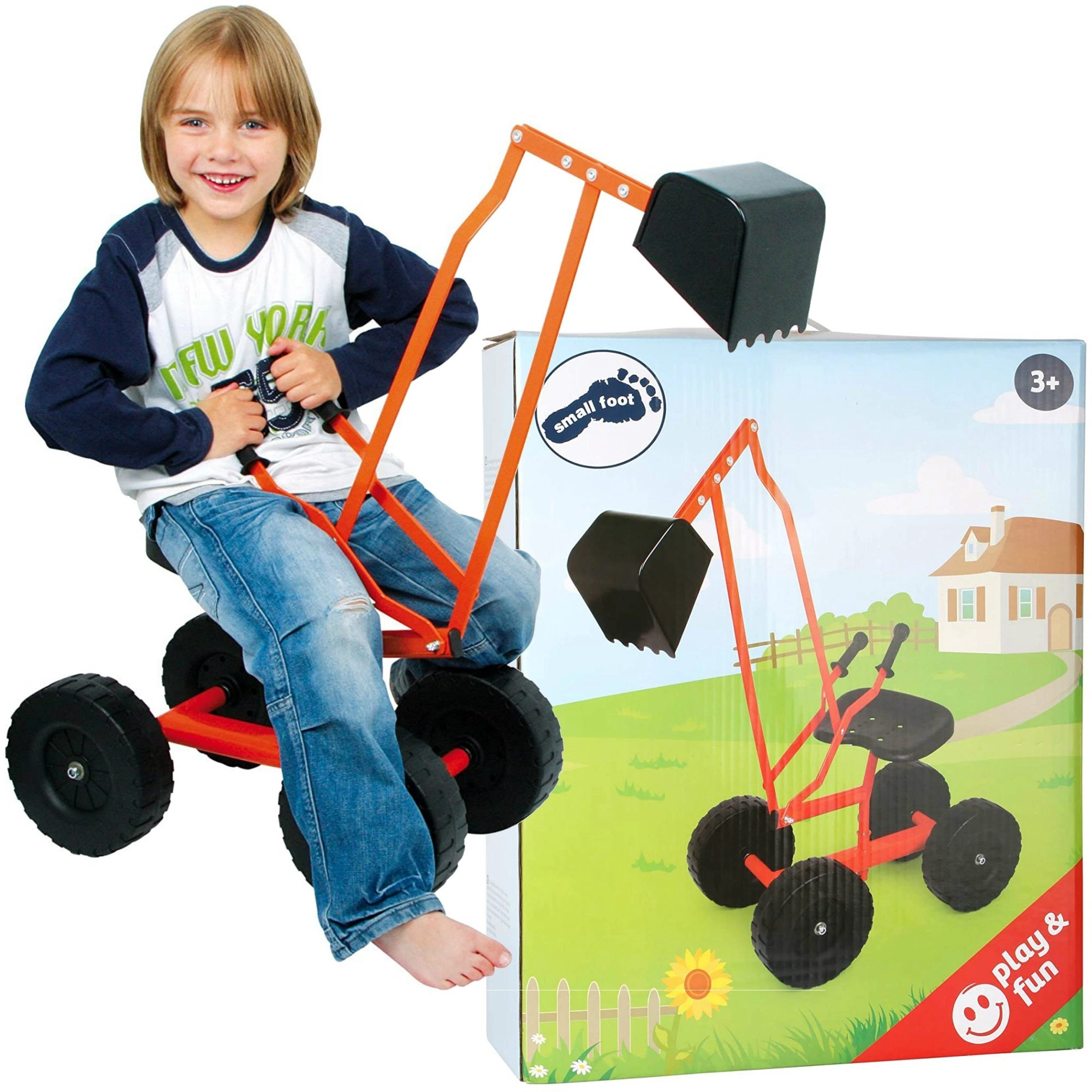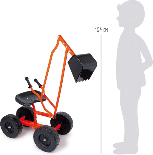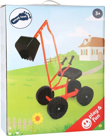 Excavator robust pentru copii de la Small Foot pentru joacă în aer liber, pe nisip sau în grădină. Oferă un cadru metalic, roți mari pentru stabilitate, cupă rotativă 360° și un scaun confortabil cu comandă cu pârghii a brațului.