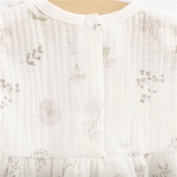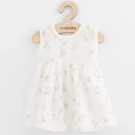 Rochiță din muselină pentru bebeluși, foarte ușoară și respirabilă, de la brandul New Baby Zoe, care încântă prin confort și stil. Are croială tip A, fustiță încrețită și închidere la spate cu capse pentru îmbrăcare ușoară. Din 100% bumbac pentru finețe, respirabilitate și confort la purtare pe tot parcursul zilei.