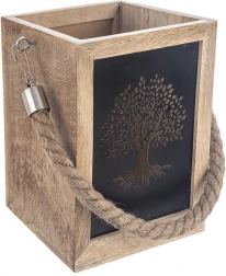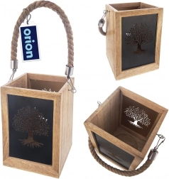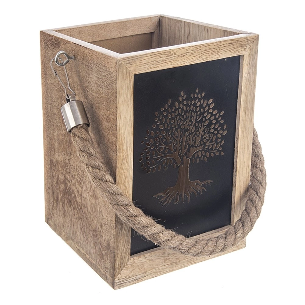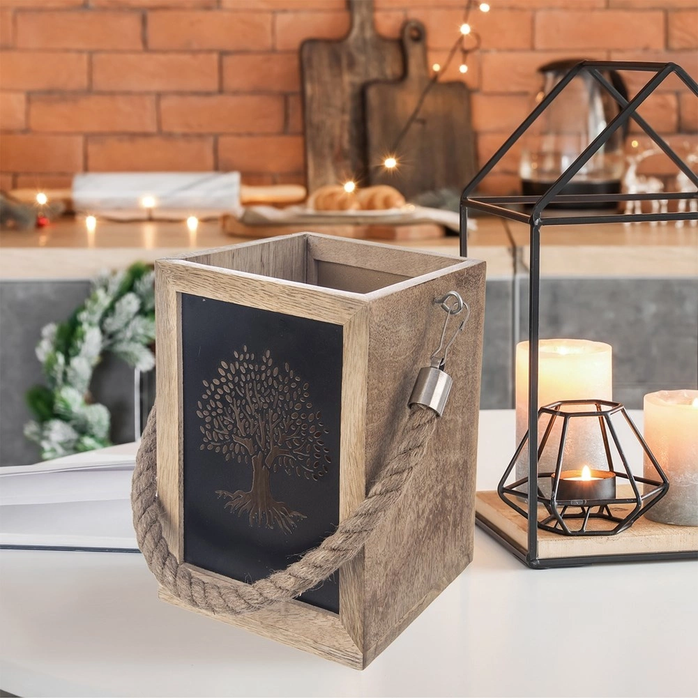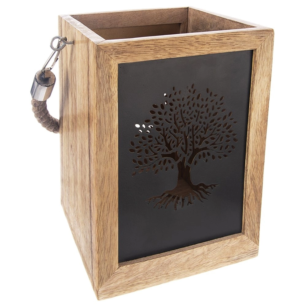 Lampion stilat din lemn de mango cu panouri metalice negre și decupaj în formă de arbore creează, după aprinderea lumânării, o decorațiune luminoasă impresionantă. Datorită mânerului din sfoară, robust, poate fi ușor transportat sau agățat, iar partea superioară deschisă asigură ventilare sigură. Ideal pentru lumânări tip pastilă și lumânări clasice, pe balcon, terasă și în interior.