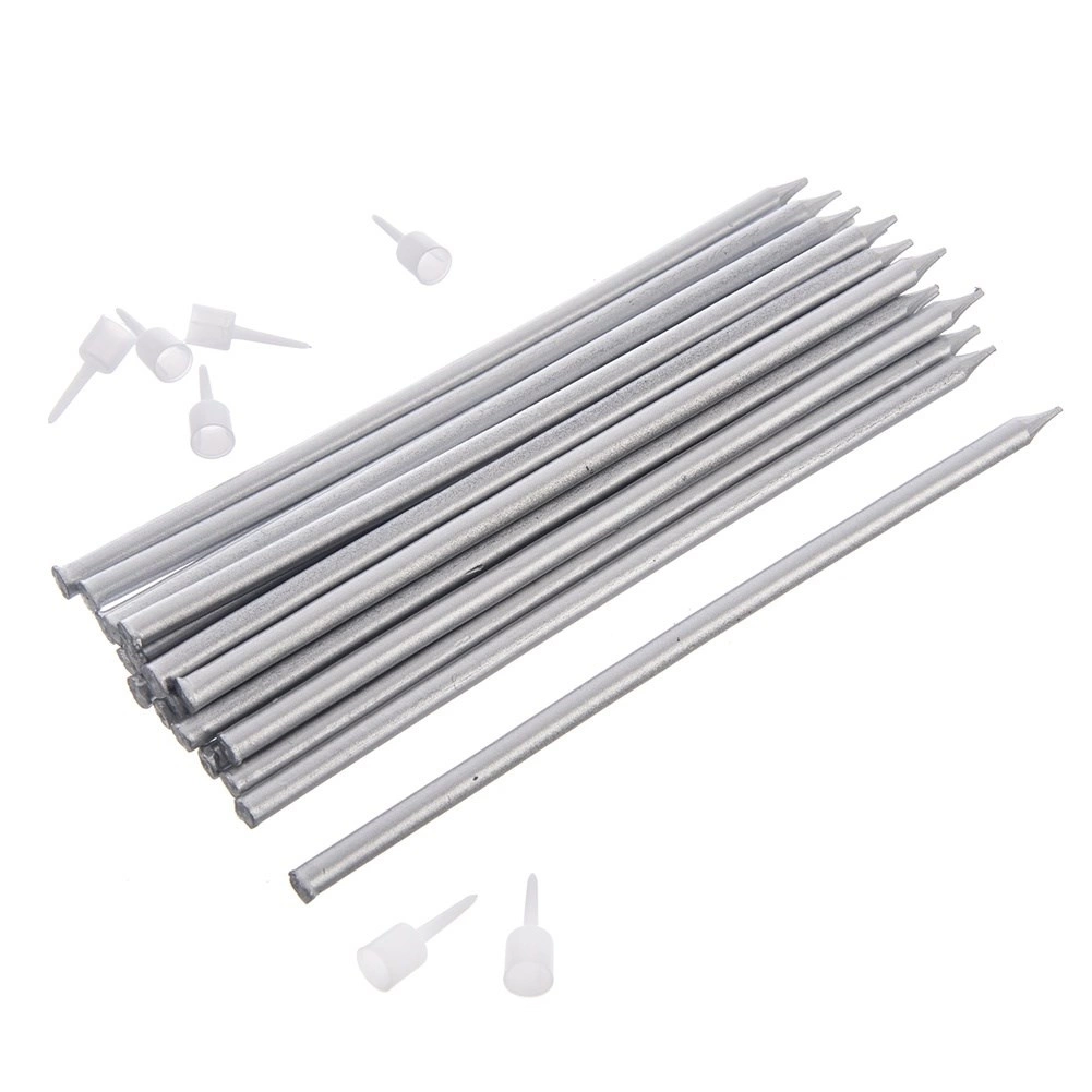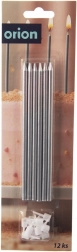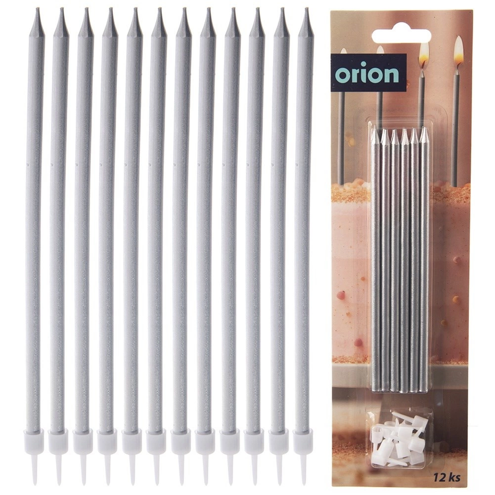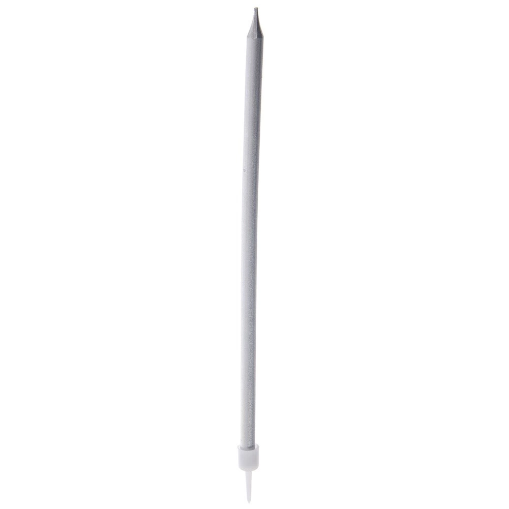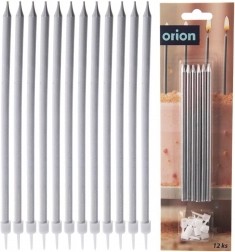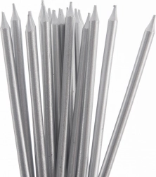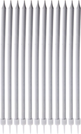 Set elegant de 12 lumânări lungi pentru tort, în culoare argintie metalizată, cu înălțimea de 14,5 cm, ideale pentru torturi și deserturi festive. Include suporturi albe din plastic pentru fixare stabilă. Designul proaspăt și înălțimea spectaculoasă oferă fiecărei petreceri un aspect deosebit. Culoarea argintie universală se potrivește oricărui tort.