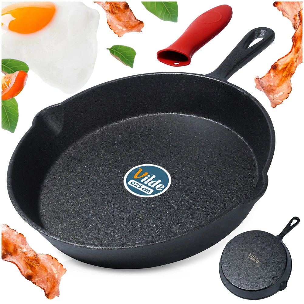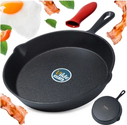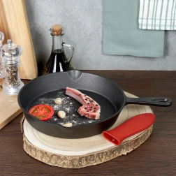 Pachetul include un mâner din silicon roșu pentru manipulare sigură a mânerului fierbinte. Tigaia este potrivită pentru toate tipurile de plite, inclusiv inducție, pentru cuptor, grătar și direct deasupra focului deschis – ideală pentru bucătărie, camping și grătare în aer liber.