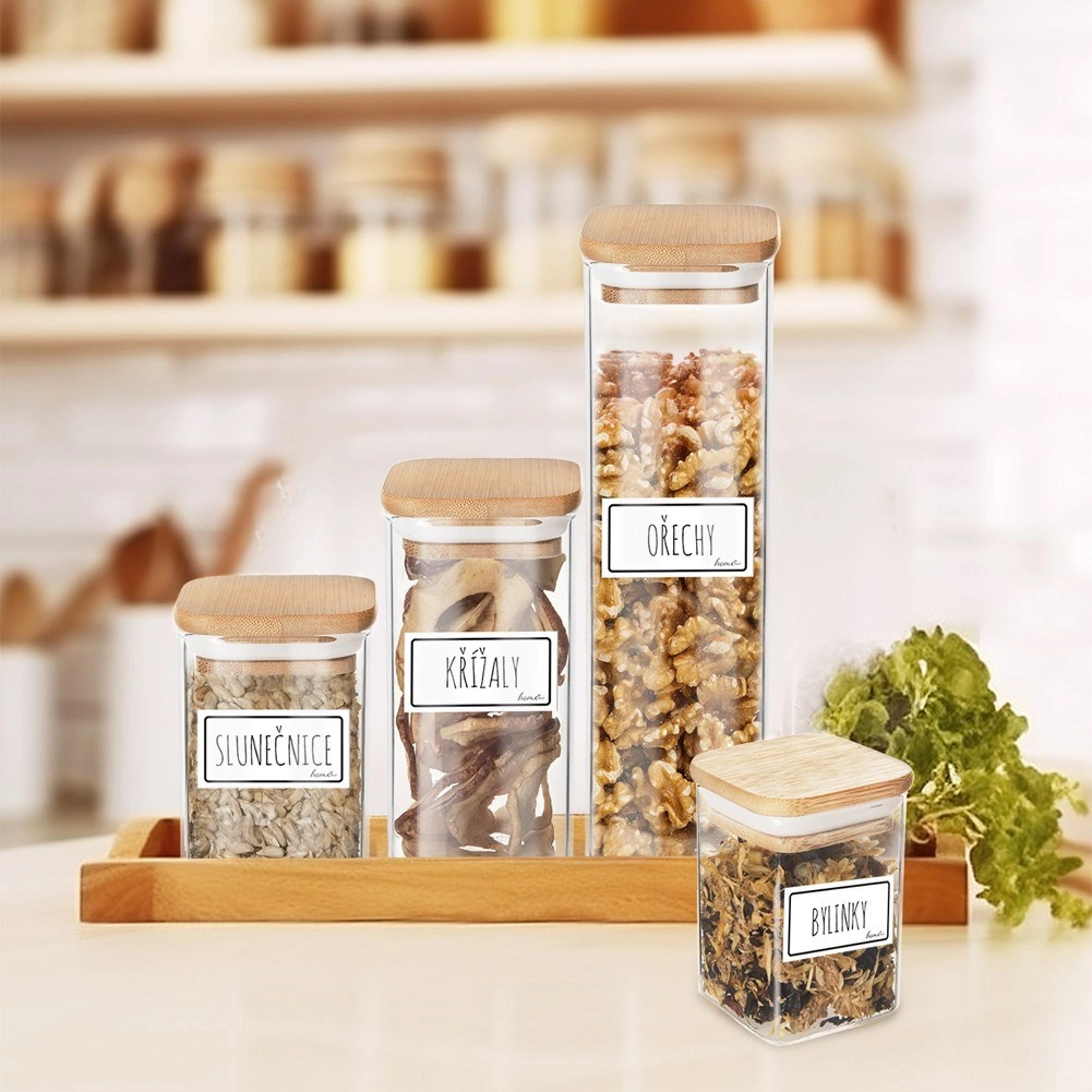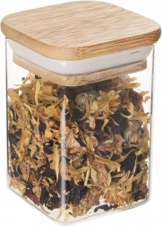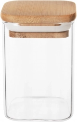 Acest borcan cu design modern combină sticla borosilicată și capac din bambus cu garnitură din silicon pentru o închidere etanșă și sigură. Sticla transparentă permite controlul imediat al conținutului, iar capacul elegant adaugă un accent natural raftului sau blatului. Datorită dimensiunilor compacte, economisește spațiu și se combină ușor în seturi.