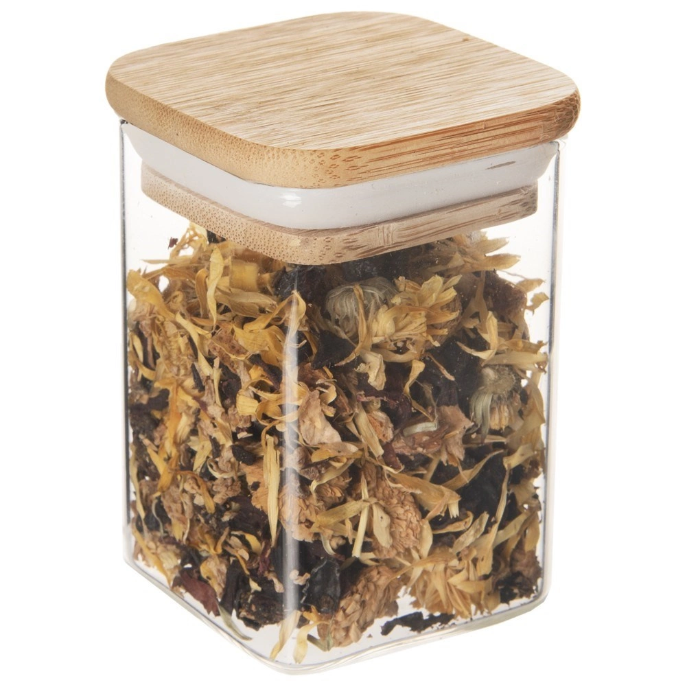 Elegantul borcan din sticlă de 200 ml, cu capac din bambus și garnitură din silicon, păstrează alimentele proaspete mai mult timp. Este realizat din sticlă borosilicată rezistentă, are dimensiuni compacte de 6 × 6 × 8,5 cm și o formă modernă pătrată. Ideal pentru cafea, ceai, condimente, nuci și alte ingrediente vrac. Datorită închiderii etanșe, protejează aroma și gustul și se potrivește perfect în orice bucătărie.