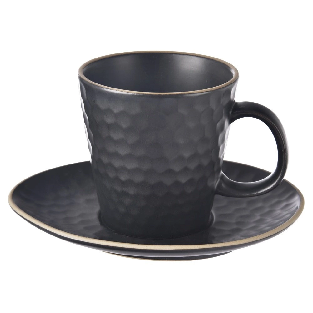 Descoperă ceașca de espresso care combină designul atemporal cu utilitatea practică. Ceramica neagră cu efect mat subtil evidențiază structura hexagonală în relief, datorită căreia ceașca și farfurioara arată elegant și foarte modern. Dimensiunea perfectă de 95 ml garantează gustul plin al espressoului.