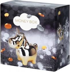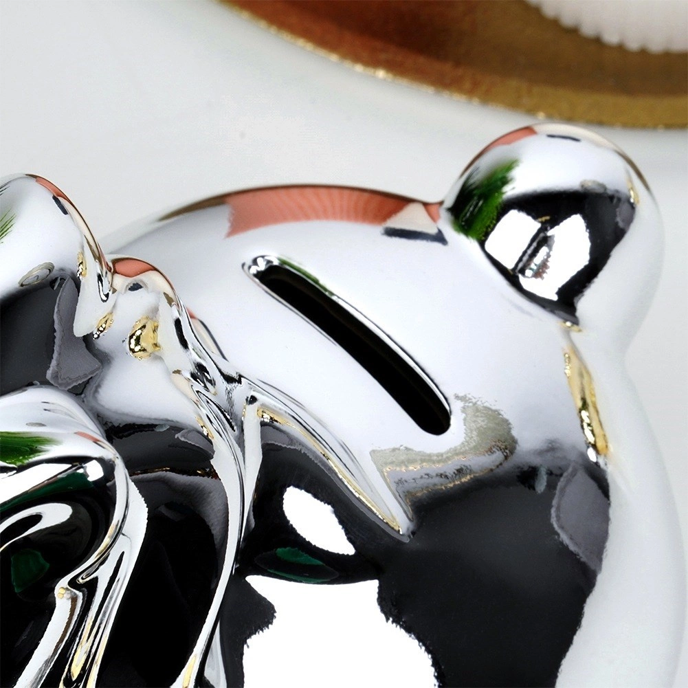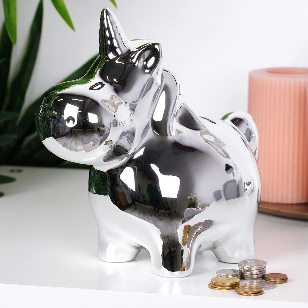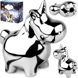 Această pușculiță din ceramică în formă de unicorn se remarcă prin suprafața argintie tip oglindă, care adaugă casei tale o notă de glamour. Cu dimensiunile 18 × 10,5 × 18 cm, oferă suficient spațiu pentru monede și bancnote pliate, stând stabil pe raft, comodă sau birou.