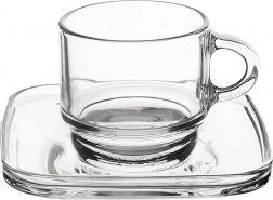 Sticla transparentă evidențiază culoarea și crema espresso-ului, în timp ce farfurioara pătrată adaugă un aspect modern și stabilitate practică.