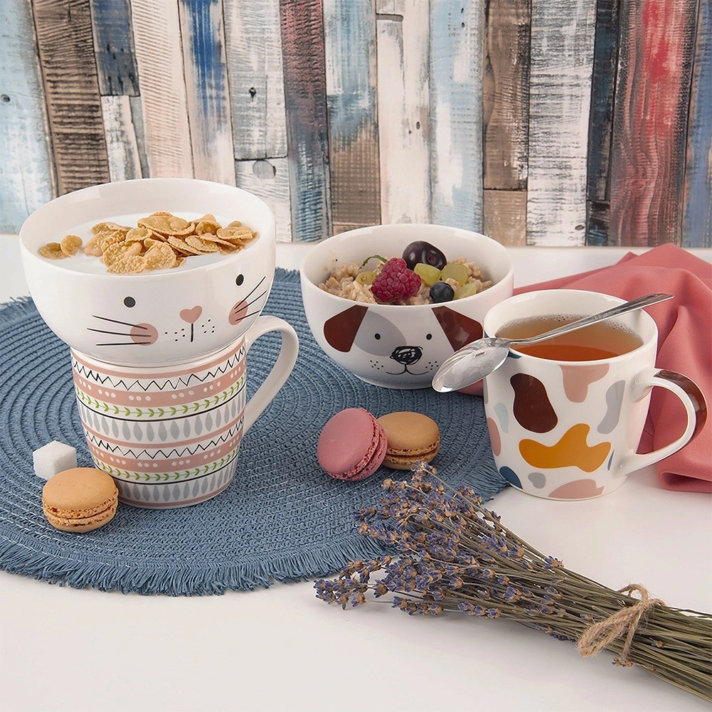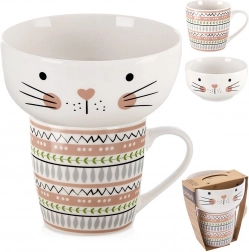 Bucurați-vă de un mic dejun servit cu stil. Acest set din porțelan, cu o drăguță față de pisică, îmbină cana și bolul într-un ansamblu jucăuș – pe placul copiilor și al adulților. Porțelan de calitate cu glazură netedă și lucioasă, plăcut la atingere, rezistent la utilizarea zilnică și ușor de întreținut.