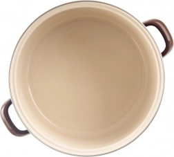 Elegantă și cu aer retro, oala combină exteriorul maro cu interiorul crem și o margine din inox pentru rezistență sporită. Stratul emailat, sigur pentru sănătate, este blând cu preparatele și potrivit pentru alergici, asigurând curățare ușoară și durată de viață îndelungată. Datorită volumului de 8 l, preparați confortabil supe de oase, gulașuri și paste pentru întreaga familie.