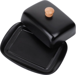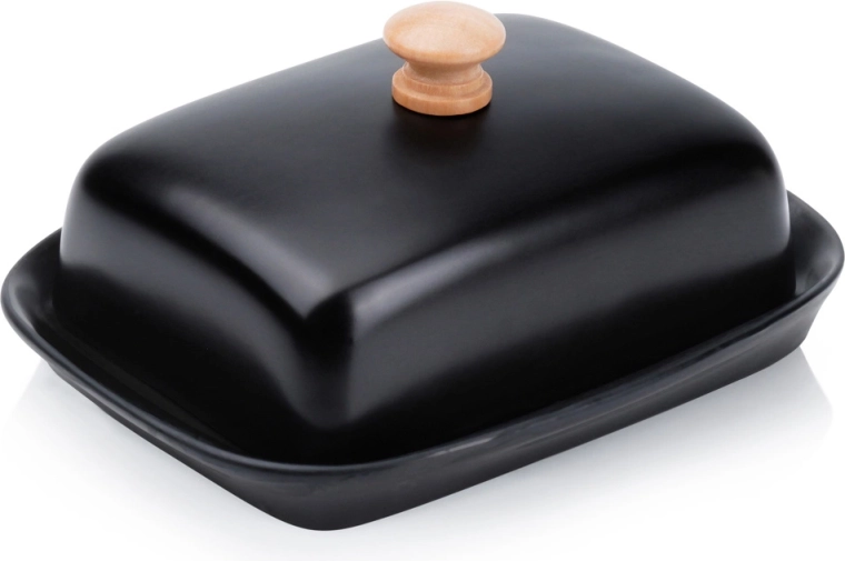 Capacul ceramic bine fixat, cu buton din lemn, păstrează untul proaspăt mai mult timp, protejat de mirosuri și praf, și se deschide totodată cu ușurință.