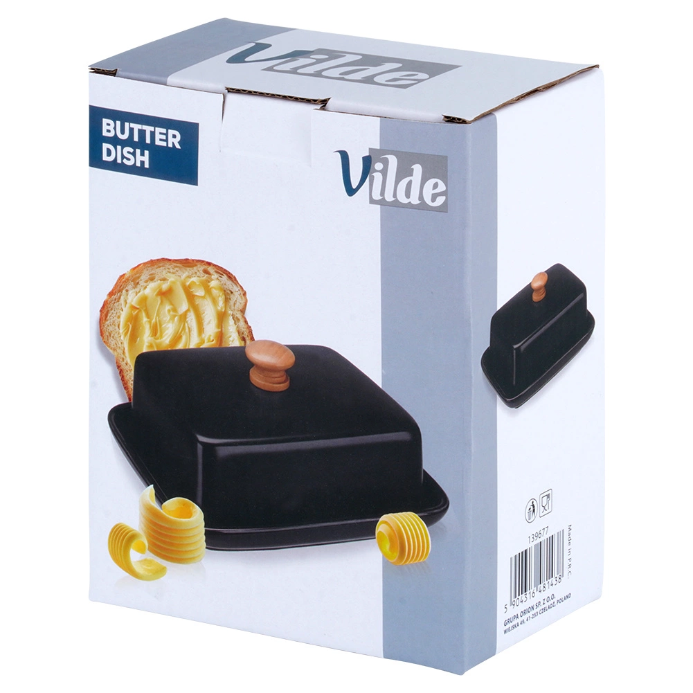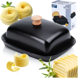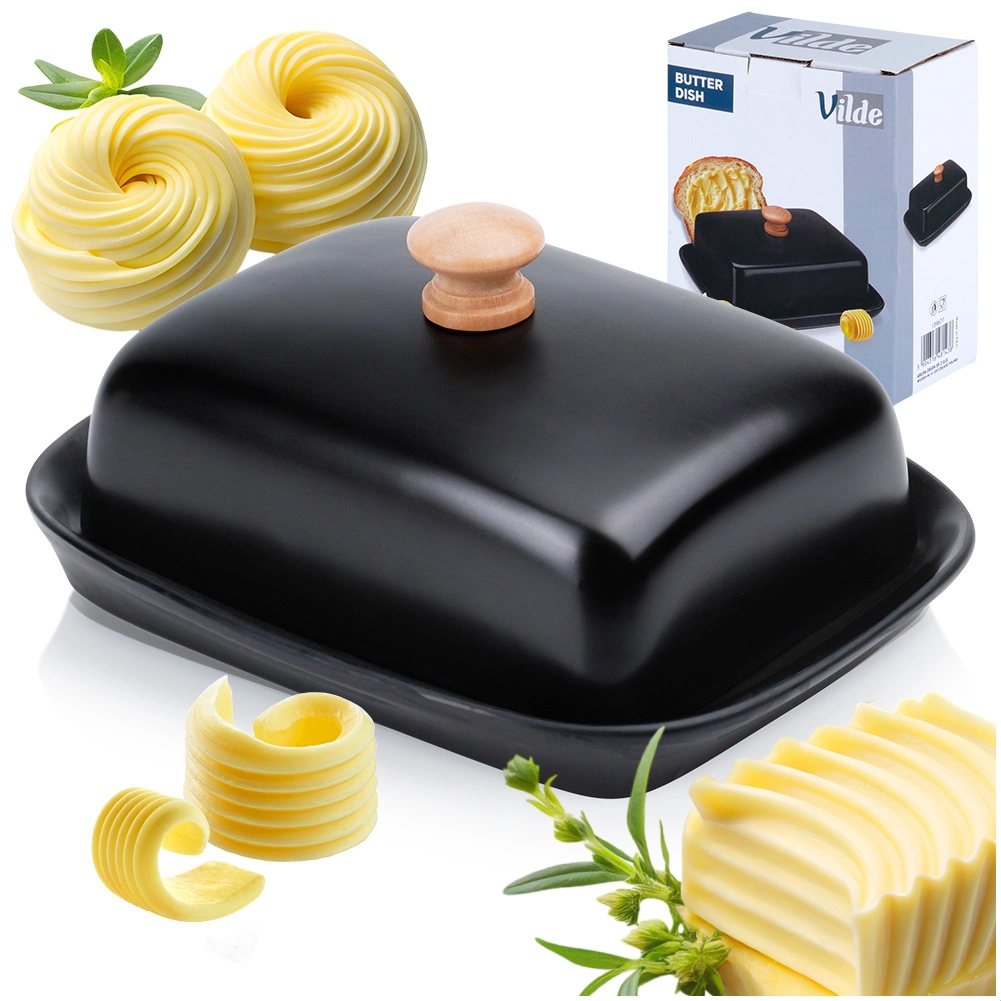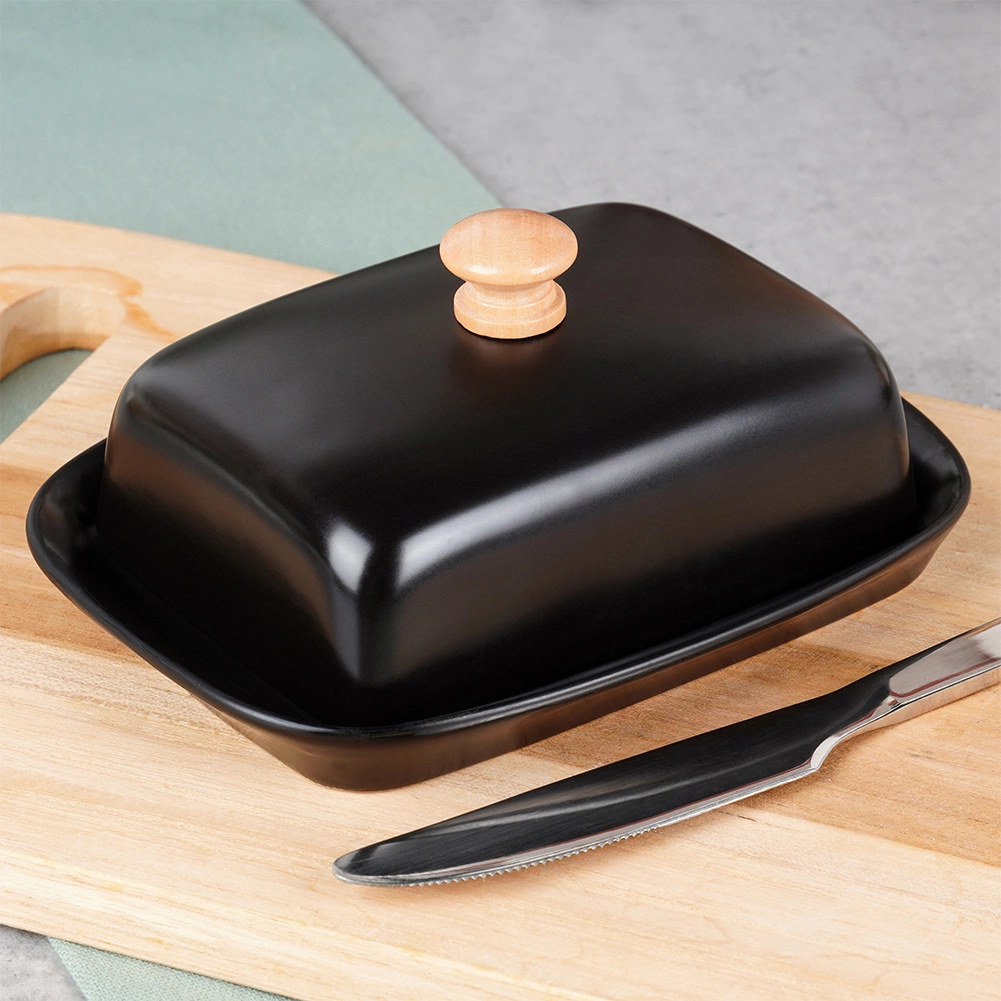 Această untieră stilată din ceramică de calitate, în finisaj negru, este ideală pentru utilizarea zilnică acasă și pentru servirea la masă. Mânerul din lemn de pe capac permite ridicarea comodă, în timp ce capacul bine fixat protejează untul de uscare și mirosuri străine.