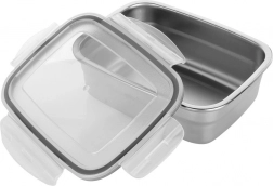 Capacul transparent cu garnitură din cauciuc și 4 cleme robuste asigură o închidere fiabilă fără scurgeri. Vasul din inox menține mai bine temperatura dorită a preparatelor – calde sau reci – și este rezistent la mirosuri și pete. Cutia poate fi spălată comod în mașina de spălat vase.