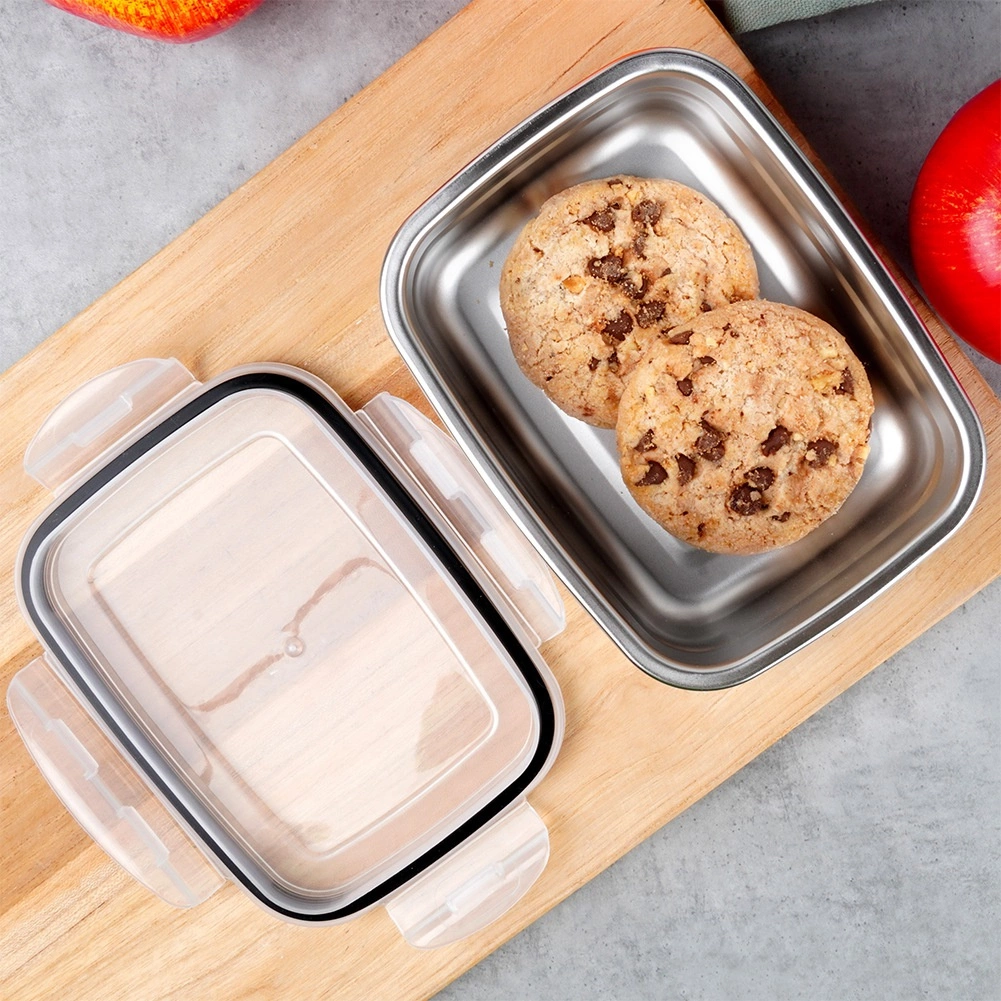 Cutia practică și igienică pentru alimente, din oțel inoxidabil, protejează mâncarea de umiditate și aer, o menține proaspătă mai mult timp și este ideală pentru utilizare zilnică. Datorită dimensiunilor compacte de 14,5 × 11,5 × 5,5 cm încape în geantă sau în ghiozdan, iar volumul de 500 ml este perfect pentru salate, garnituri sau gustări.