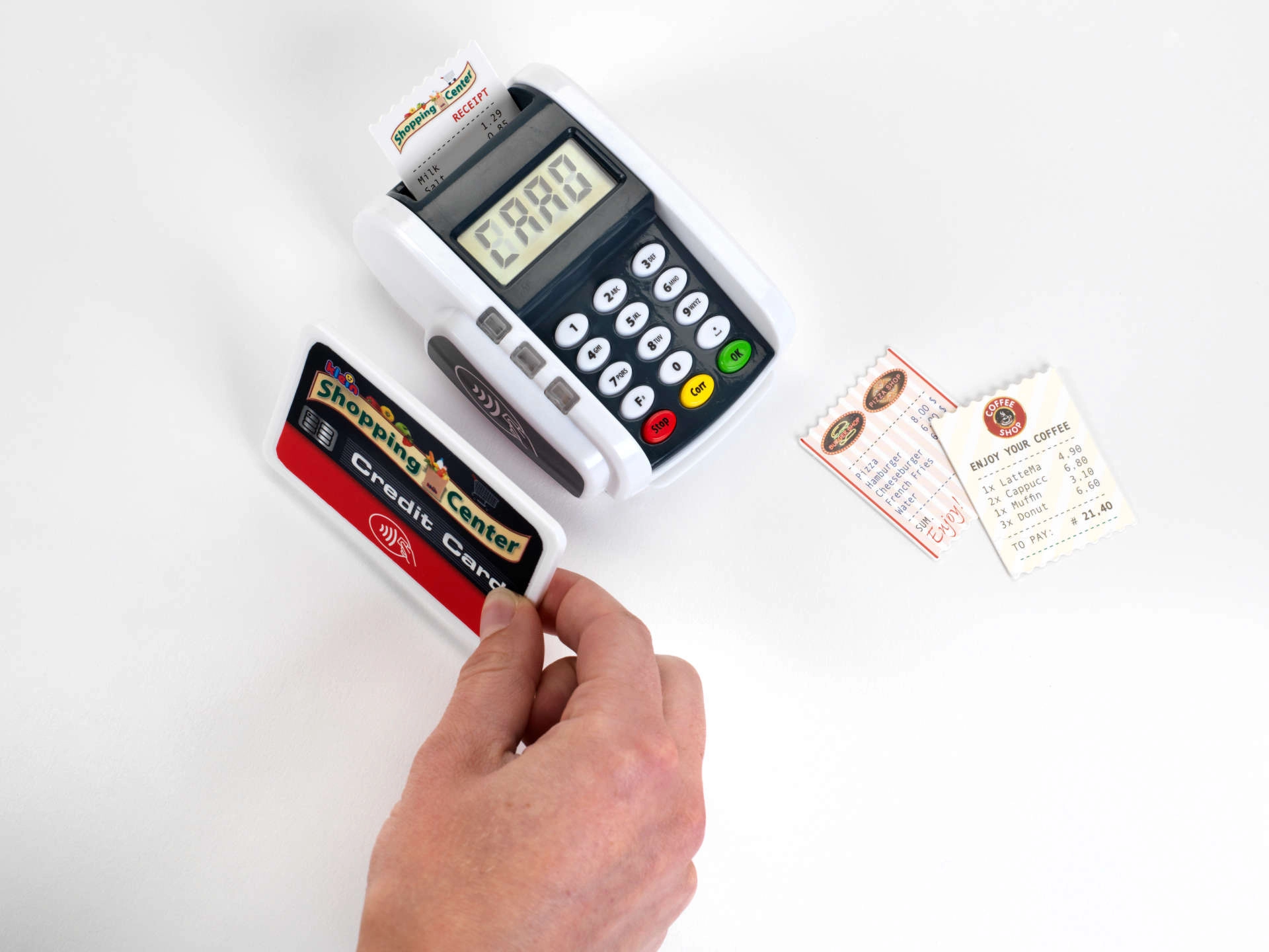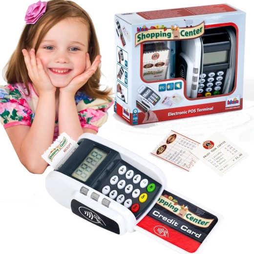 Copiii pot exersa apropierea cardului și apăsarea tastaturii – ideal pentru jocul de-a casierul.