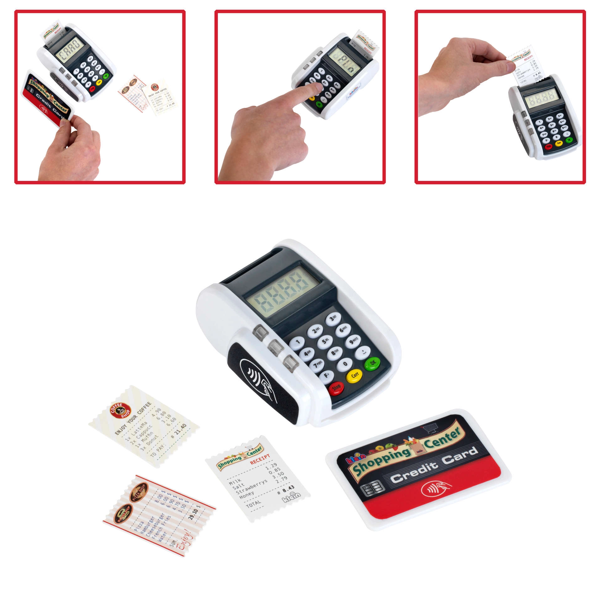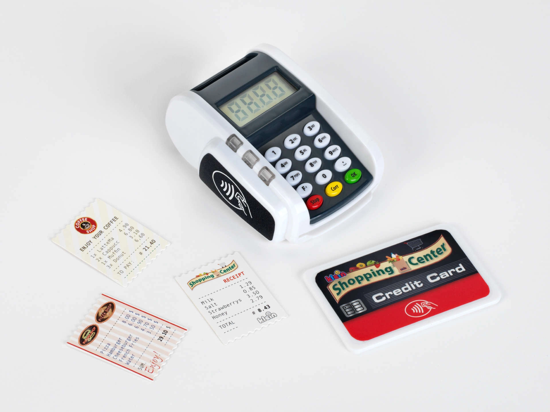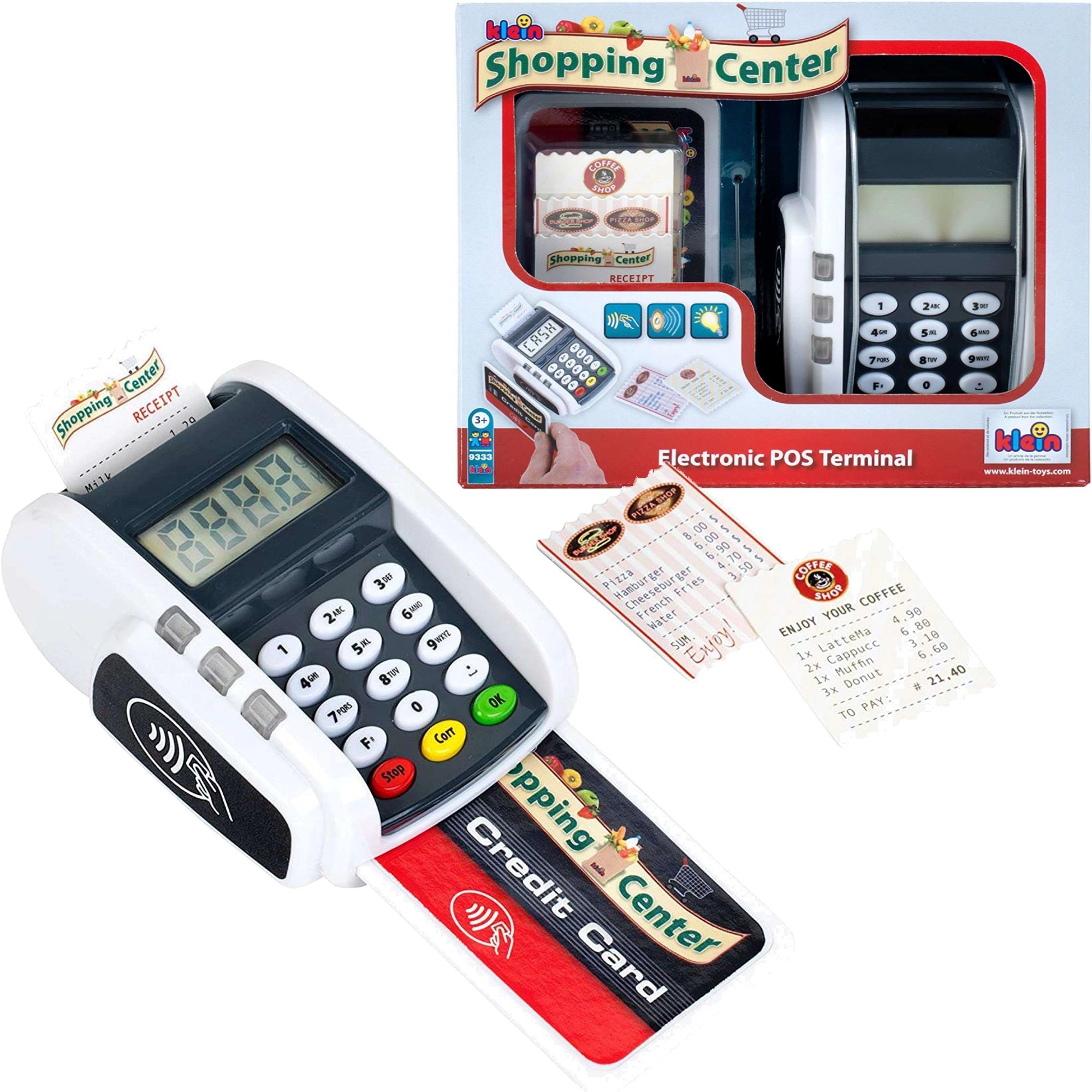 Terminalul de plată realist pentru copii de la KLEIN aduce distracția de la casa de marcat. Oferă butoane funcționale, cititor pentru plăți contactless, efecte luminoase și sonore și le permite copiilor să își dezvolte imaginația jucându-se de-a magazinul sau restaurantul.