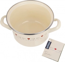Oală stilată cu design retro, din oțel emailat de calitate, culoare crem, cu motiv discret de inimioare. Volumul practic de 1,4 l este ideal pentru supe, sosuri, garnituri sau gătitul zilnic. Emailul este rezistent, ușor de curățat și prietenos cu sănătatea – potrivit și pentru alergici.