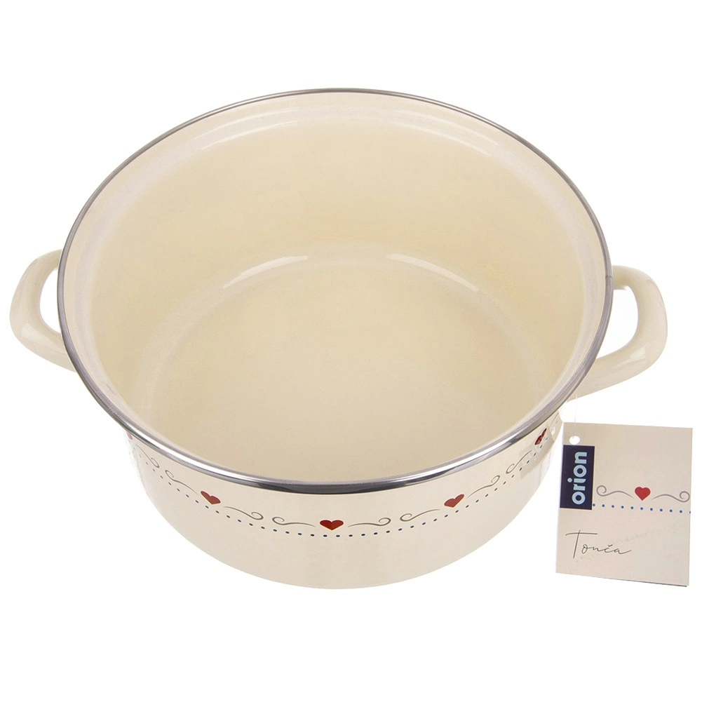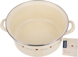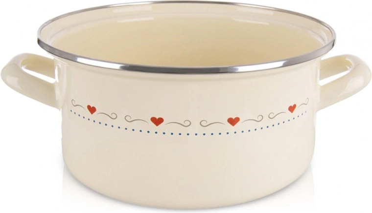 Oală emailată elegantă cu un volum de 4 l, în culoare crem cu motiv discret de inimioare, ideală pentru gătit și înăbușit mâncăruri de zi cu zi. Datorită oțelului emailat de calitate, marginii din inox și mânerelelor ergonomice solide, oferă durabilitate, prindere sigură și întreținere ușoară. Potrivită pentru toate tipurile de plite, inclusiv inducție, precum și pentru cuptor, cu posibilitatea de spălare în mașina de spălat vase.