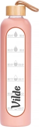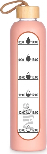 Menține-ți hidratarea cu stil. Această sticlă în nuanță somon combină designul elegant cu practicitatea: sticlă borosilicată rezistentă, capac din bambus sigur cu curetă textilă și husă din silicon pentru prindere sigură și protecție la șocuri. Datorită marcajelor orare îți urmărești ușor aportul de apă pe tot parcursul zilei.