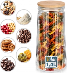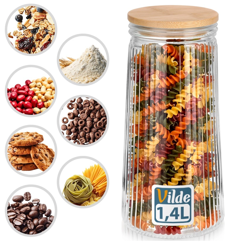 Păstrați cămara ordonată și alimentele proaspete mai mult timp. Borcanul din sticlă de 1,4 l combină sticla borosilicată cu capacul din bambus și garnitura din silicon pentru o etanșeitate fiabilă. Corpul transparent cu striații verticale oferă un aspect modern și permite verificarea instantanee a conținutului.